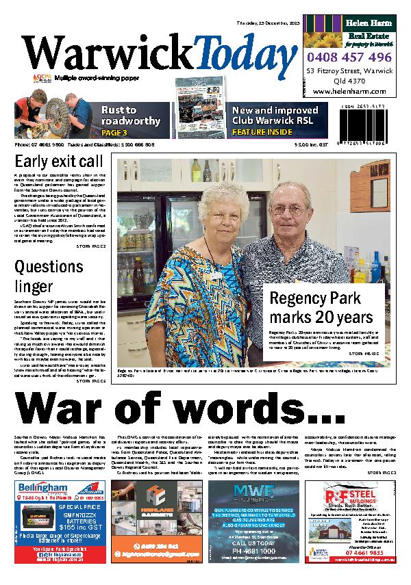 Warwick Today – 25th December 2025 Subscribe or Login to see the rest of the content. Username Password * Remember Me Forgot Password News Proposed subdivision could add 28 rural residential lots south of Allora 07/01/2026 The Pidgeon family have lodged plans for a subdivision that would add 28 rural residential lots just south of Allora. Documents lodged with the Southern... Social action at The Summit 06/01/2026 Two games of social bowls were played on Saturday afternoon at The Summit. Results were as follows: Game 1 – Mark Wicks and Rob Capelli... GALLERY: All the action from the Warwick New Year’s Eve Rodeo 06/01/2026 Bucking bulls and crowds aplenty rode in the new year with style at the annual Warwick New Years Eve Rodeo. Singleton bull rider Kyle Hall...