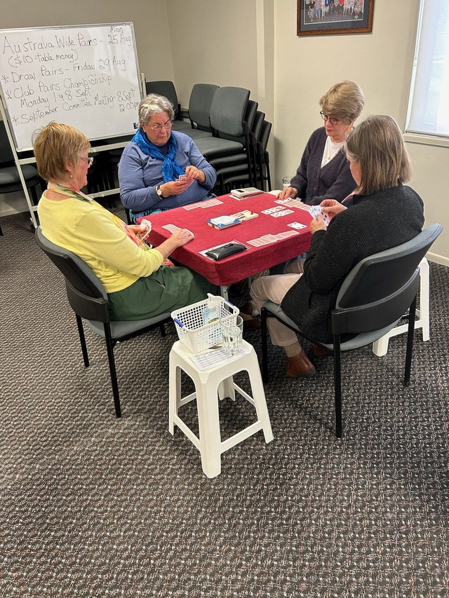 Results, Monday, 10/11/25 (5 & 1/2-table Howell): T. Hinde P. Campbell (65.7) 1; J. Nankervis P. Kelly (58.8) 2; R. Hart N. McGinness (57.4) 3; N. Collins M. Simpson (54.6) 4. Friday, 14/11/25 (5-table Mitchell); N/S H. Price R. Hart (54.1) 1; N. Bonnell S. Head (52.2) 2. E/W D. Moran N. McGinness (64.8) 1; W.Milne J. Sipple (55.6) 2.