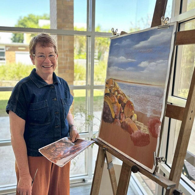 Warwick Artists Group member Susan Shaw working on a pastel painting in the Gallery foyer. (Supplied Warwick Art Gallery).